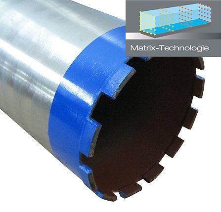 Diamantové vrtáky na mokré použitie s matricovými strešnými segmentmi, špeciálne vyvinuté pre extrémne vystužený betón. Vďaka diamantom usporiadaným v matrici sa dosahuje veľmi vysoká rýchlosť rezania, vynikajúce vlastnosti voľného rezania a vynikajúca životnosť nástroja.